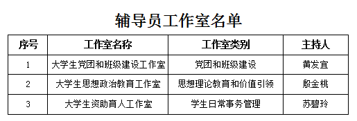 根据《关于成立辅导员工作室的通知》,结合《广州城建职业学院辅导员工作室建设与管理办法》,学校于开展了首批辅导员工作室申报工作,经团队申报、资格审查、专家评审,确定大学生思想教育辅导员工作室等3个工作室为首批辅导员工作室建设项目。现将首批辅导员工作室建设名单予以公布。